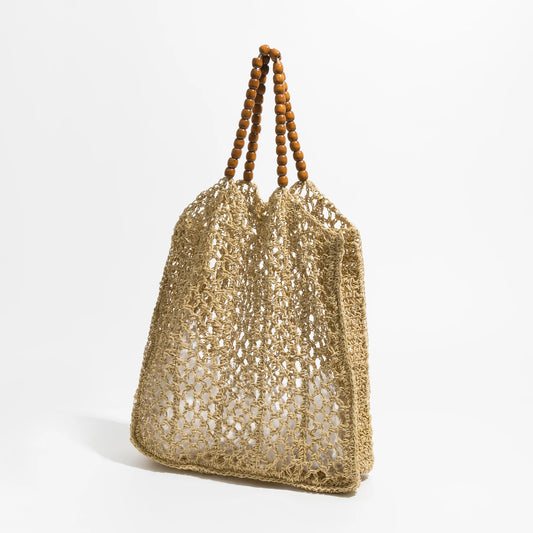 Beading Handle Straw Mesh Beach Tote Bag Hollow Out Fishing Net Square Shoulder Purse Large Daypack